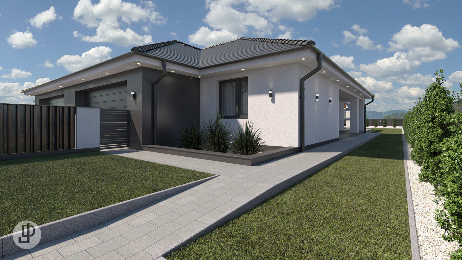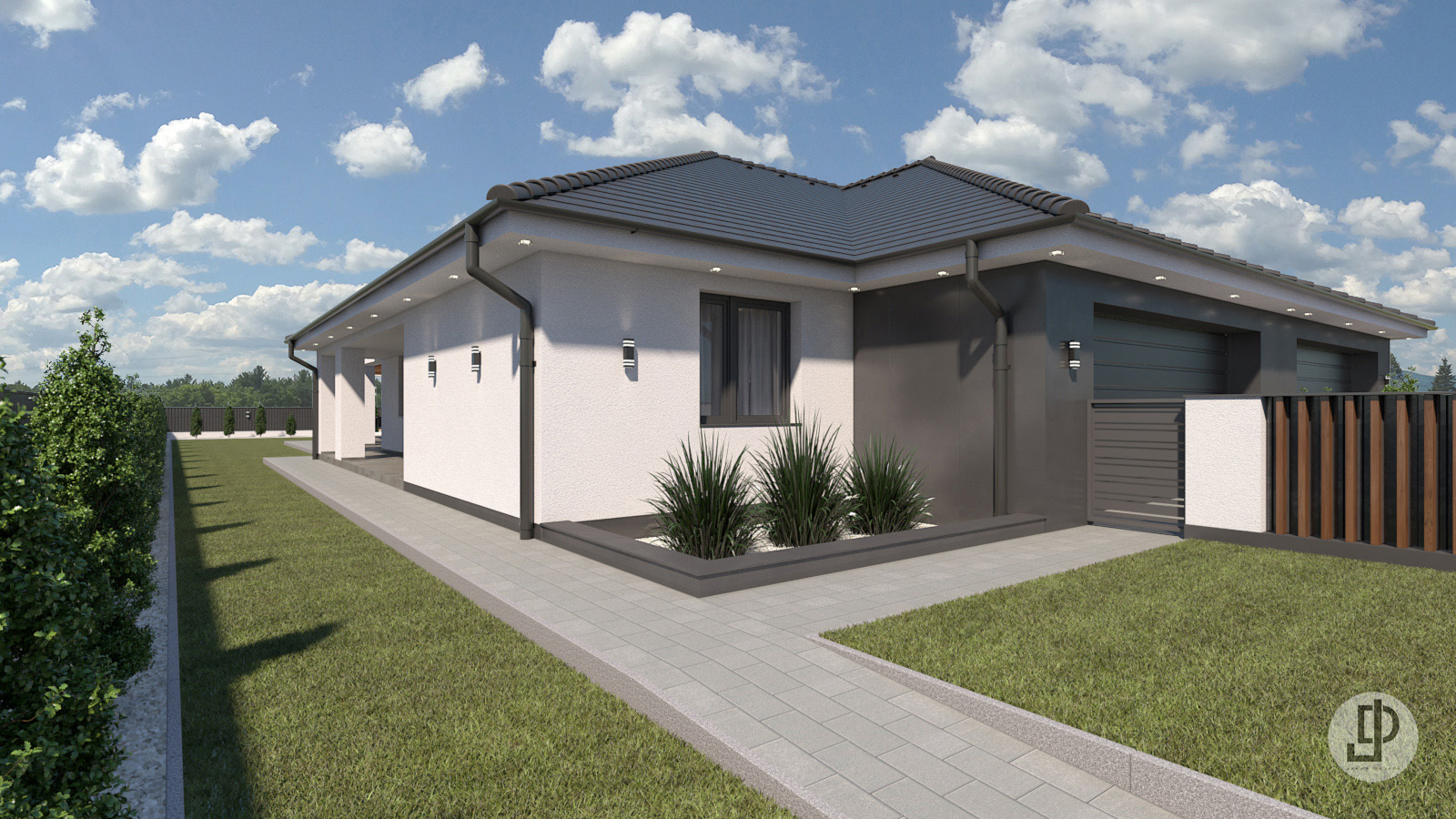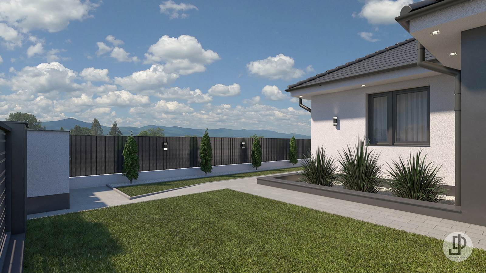 Az udvaron óriási zöldfelület található, kényelmesen kialakított térkövezett járda szakaszokkal.