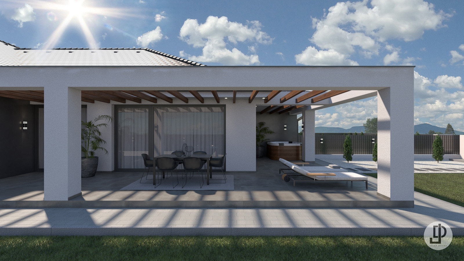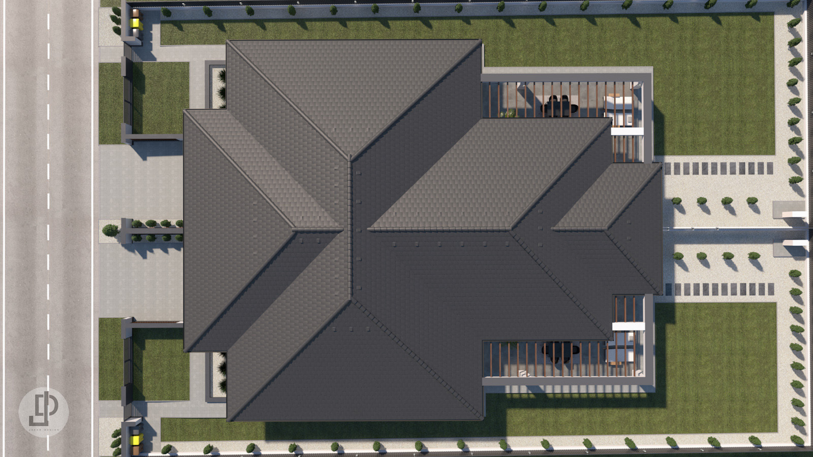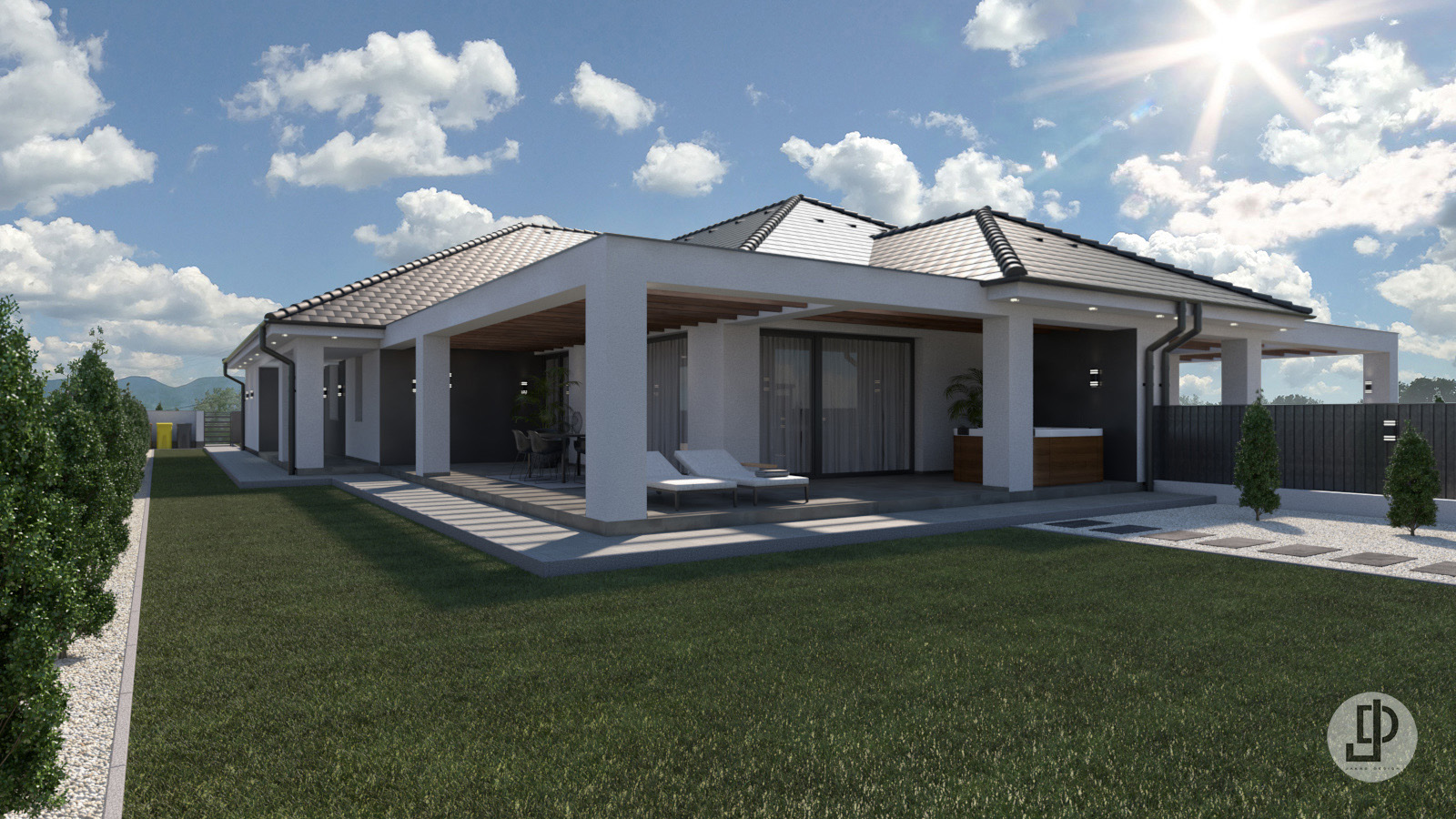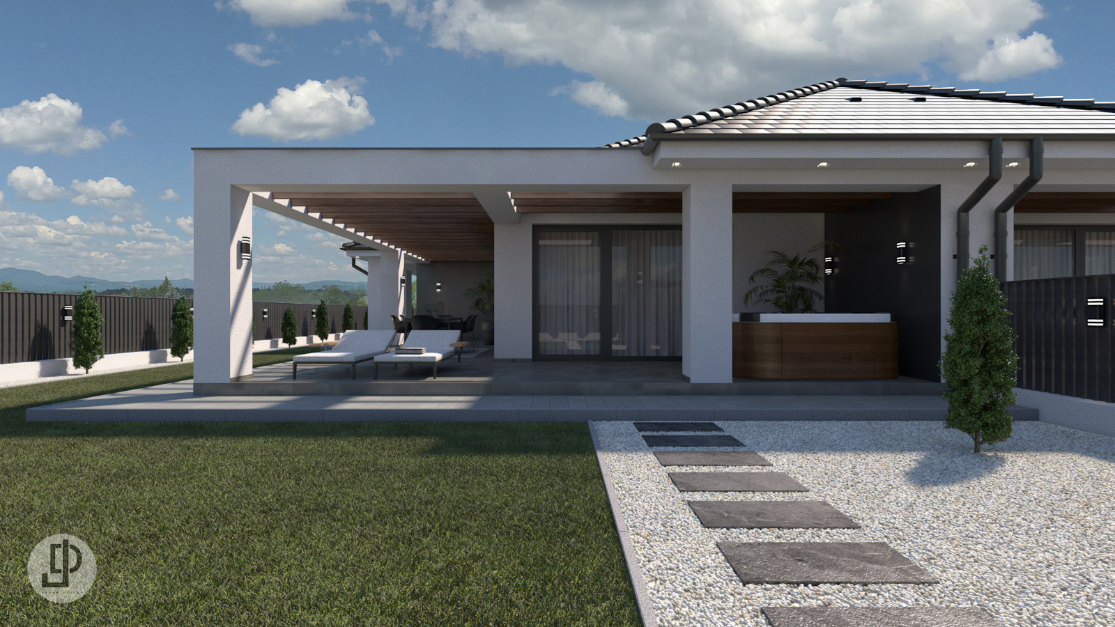 Az udvaron óriási zöldfelület található, kényelmesen kialakított térkövezett járda szakaszokkal.