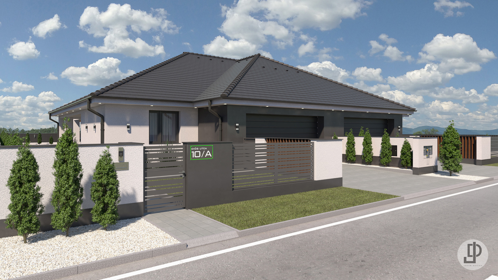 Mindkettő lakás belső falazat kialakítása megegyezik. Lakásonként 3db szoba, amerikai konyhás nappali és 2 állásos garázs található.